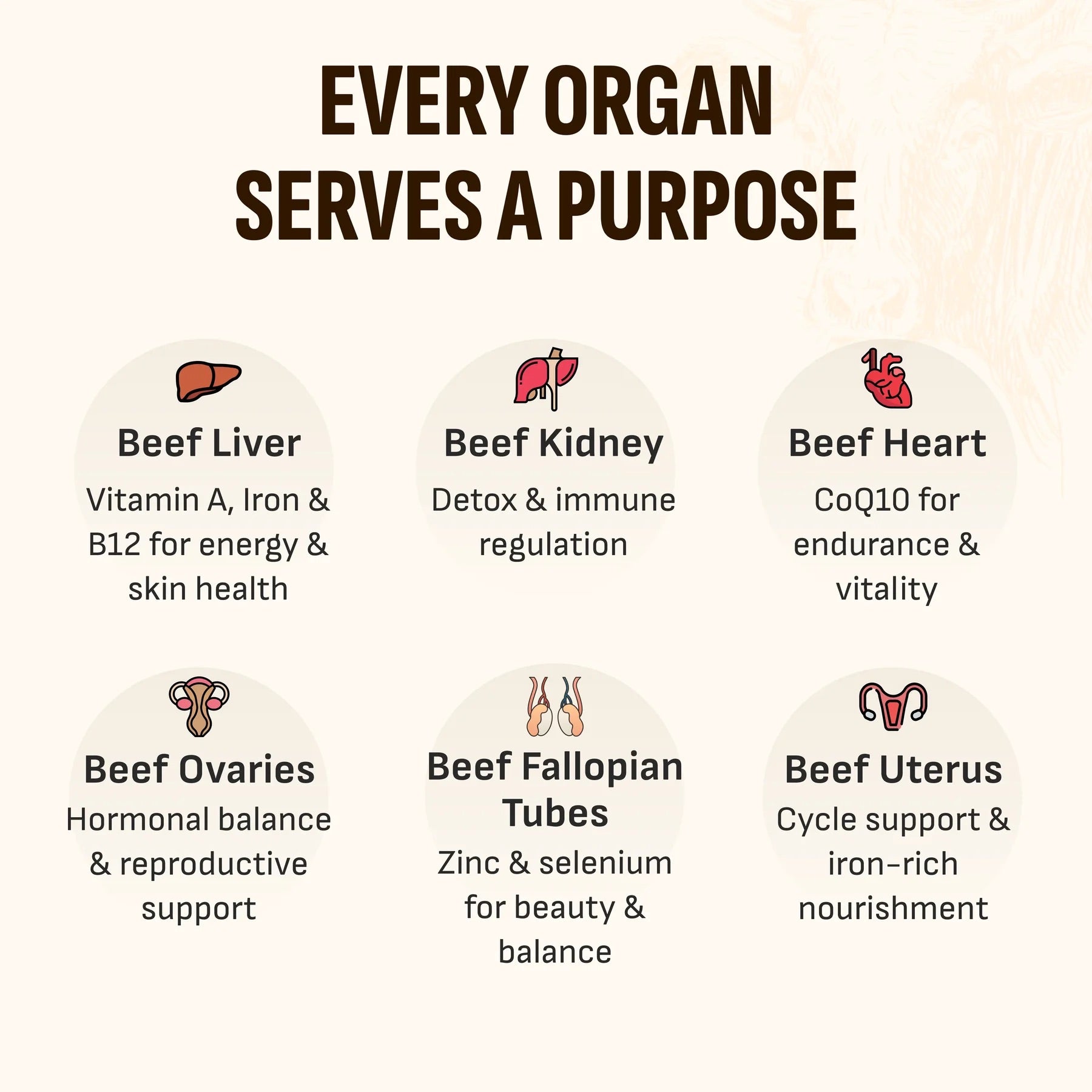 Instead of tossing in generic organ blends or trendy ingredients, we carefully selected six female-supportive organs: liver, kidney, heart, ovaries, uterus, and fallopian tubes. Each one delivers nutrients that speak directly to women’s hormonal balance, energy, mood, skin, and fertility.
